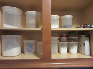 I like to keep my kitchen counters relatively free of clutter. The idea of canisters on my counter for flour, sugar, etc. does not appeal to me. Instead, I keep these items hidden in my cupboard in Rubbermaid storage containers. I even used by husband’s label maker to label the containers (I totally made fun…